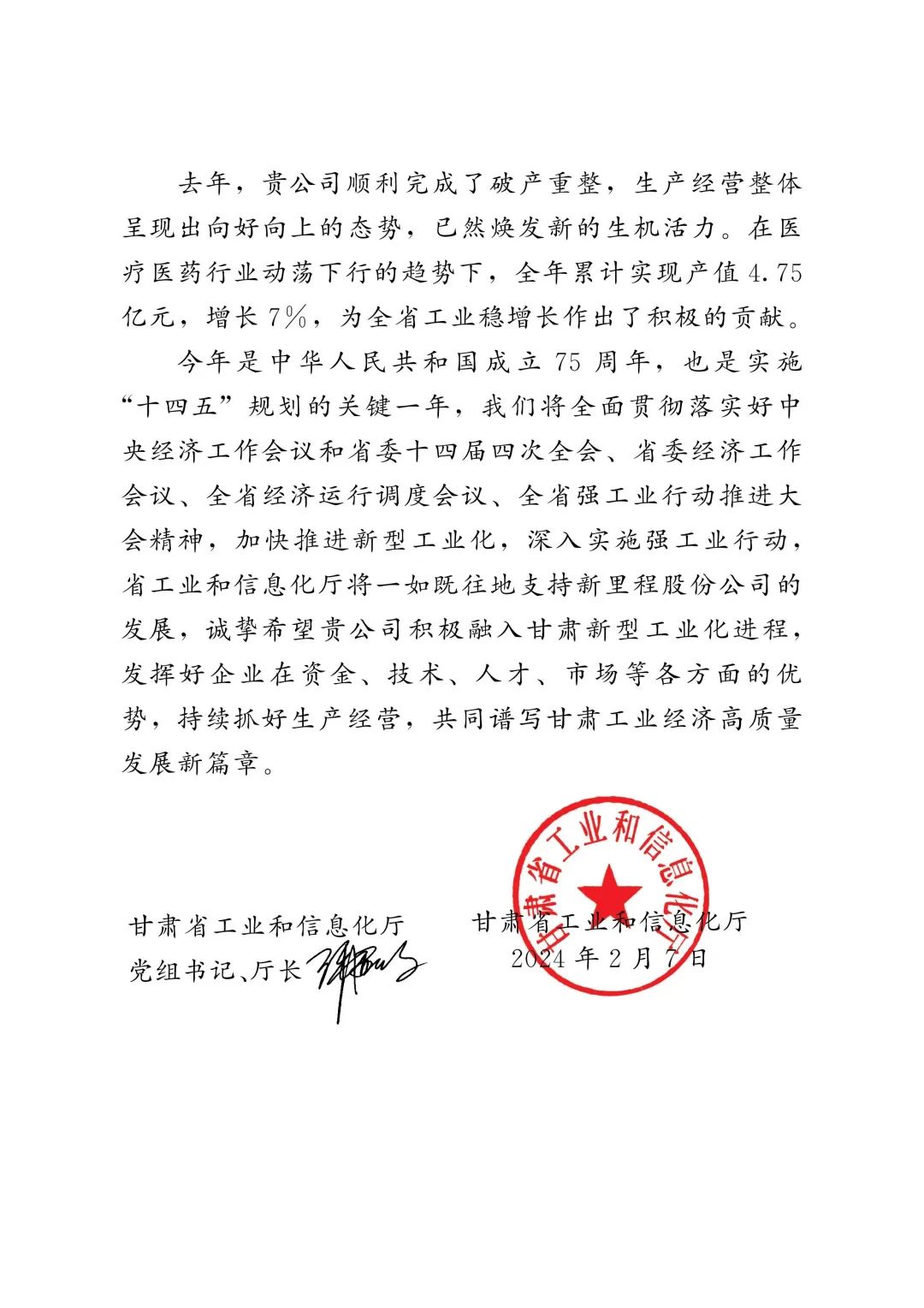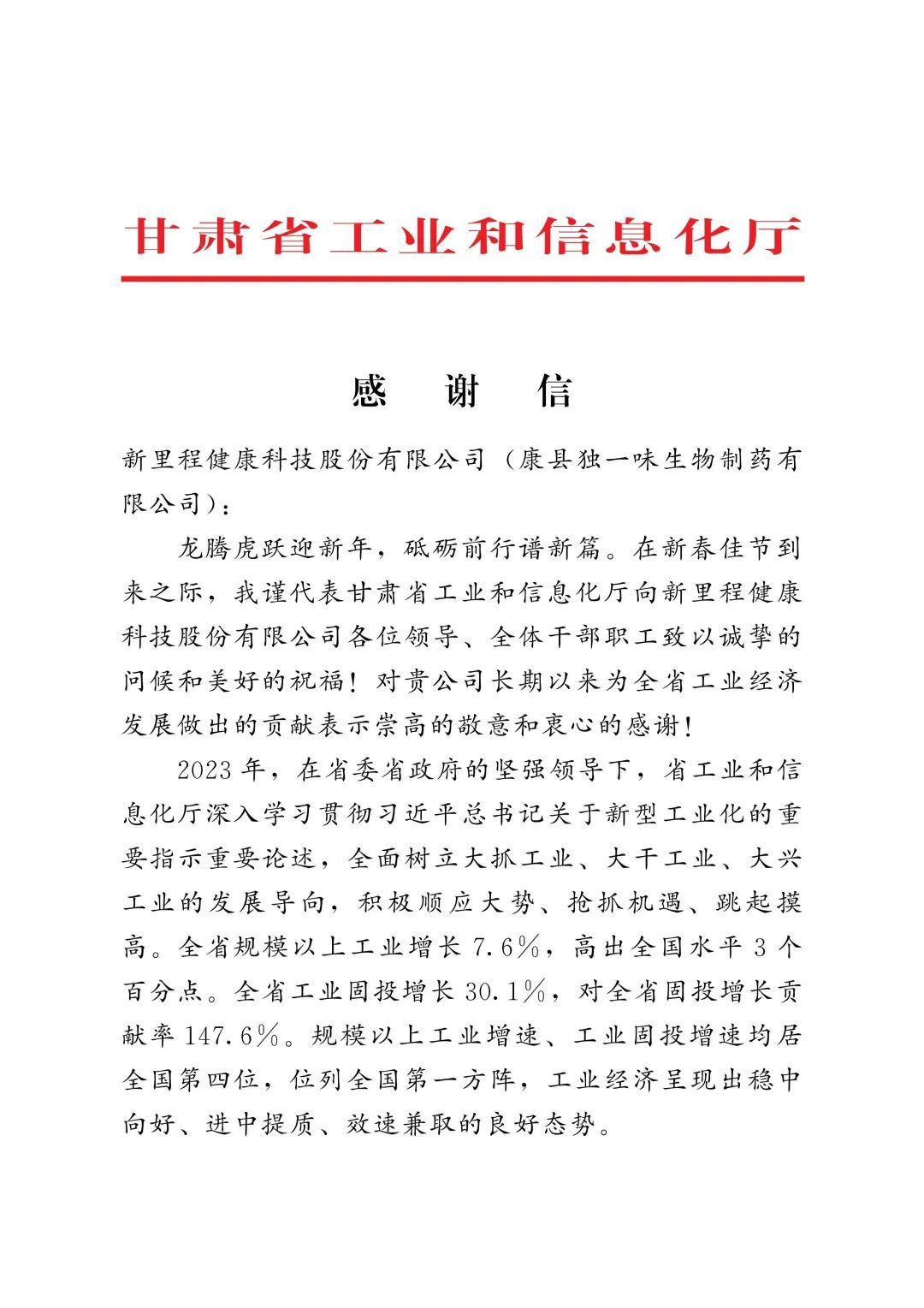 近日,甘肃省工业和信息化厅向太阳成城集团tyc234cc古天乐健康科技股份有限公司 (康县独一味生物制药有限公司)发来感谢信,对独一味制药长期以来为甘肃省工业经济发展做出的贡献表示崇高的敬意和衷心的感谢。这一认可不仅是对独一味制药过去一年工作的肯定,更是对独一味制药未来发展的鼓舞和激励。