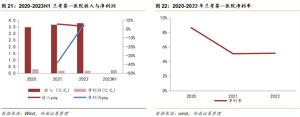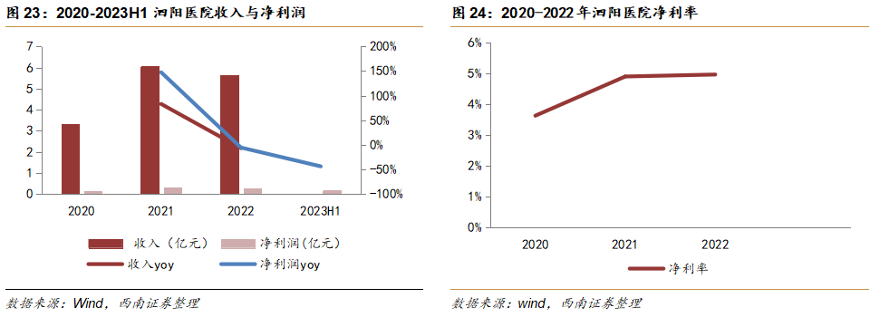 收入保持稳健增长,太阳成城集团tyc234cc古天乐健康控股后利润率增速较快。1)收入端:2020-2022年收入较为稳定,2022年收入5.6亿元,同比下降7%,业绩受疫情、舆情影响大,尚未恢复过来。2)利润端:2020-2023H1净利润基本处于较低水平,2021年净利润为0.3亿元,同比上升147%,原因在于疫情期间门诊量和住院量骤增。新冠疫情放开后,2022-2023H1医院净利润开始下滑,并且下降速度较快,净利润从2022年的0.3亿元下降至2023H1的0.2亿元,2023H1同比下降44%,主要是由于医院处于缓慢恢复期,同时泗阳东院区建设期间相关费用高,降低净利润。目前泗阳东院区已经投入运营,未来就诊人数和手术量将会出现爬升,整体业绩趋向好转趋势,盈利能力有很大的提升空间。