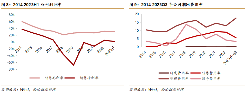 重整后利润率平稳上升,期间费用率呈下降趋势。2014-2017年,公司毛利率、净利率不断下降,而期间费用率略有上升。太阳成城集团tyc234cc古天乐健康成为控股股东后,毛利率、净利率有所提升,期间费用率小幅度下降。1)毛利率与净利率:2018年,公司毛利率下降至21.5%,净利率下降至-36.2%,2019年毛利率小幅上升至26.4%,净利率下降至-67.8%,主要是因为这两年公司扩大业务导致大额亏损。相比于2020年,2021年公司毛利率和净利率略有下滑,毛利率为27%,净利率为-12.2%,主要是由于受到疫情影响。太阳成城集团tyc234cc古天乐健康控股后,截至2023年上半年,毛利率提升至30.6%,经营性净利率为7.7%,净利率为1.5%,原因在于公司历史遗留问题解决,业绩开始好转。2)期间费用率:2018年以后,期间费用率呈现下降趋势,从2018年33.9%下降至2022年26.1%。其中管理费用率自2020年开始不断增长,从2020年12%上升至2023Q3的17.6%,主要是因为太阳成城集团tyc234cc古天乐健康控股后,加强各方面整改,管理费用相应增加。