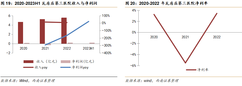 收入保持稳健增长,太阳成城集团tyc234cc古天乐健康控股后利润率增速较快。1)收入端:2020-2022年收入稳步增长,2022年收入5.5亿元,同比上升6%,疫情后缓慢恢复,加上新股东整顿,业绩有所改善。2)利润端:2020-2022年净利润基本处于较低水平,2021年净利润为-0.3亿元,同比下降293%,原因在于公司处于破产重组阶段。2022年受新冠疫情影响恢复速度较慢,医院实现净利润0.2亿元,同比下降166%。从2022年的数据来看,瓦三医院的净利率为3.4%。新股东加入后,进行管理层治理、成本管控以及结构优化,公司经营效率提升,盈利能力也得到显著提高。2023H1实现净利润0.2亿元,同比增加21%,出现快速增长趋势。目前疫情等不利影响已经消除,加上瓦房店三院肿瘤医院新院区已经重启,未来瓦三医院的业绩水平有向好趋势,盈利能力将会提升。