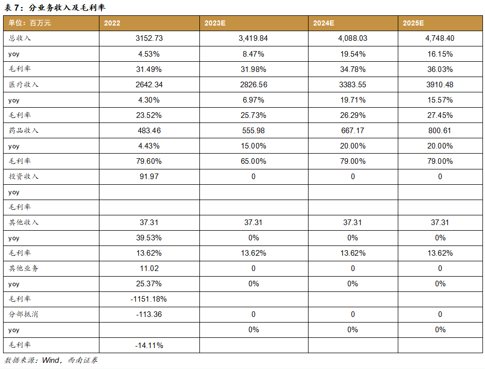 假设1:公司医疗服务板块中瓦三医院、兰考第一医院集团、泗阳医院单床产出逐渐爬升,2023-2025年增速为5%/3%/3%,随着收入规模扩大规模优势凸显,利润率水平逐渐提升;