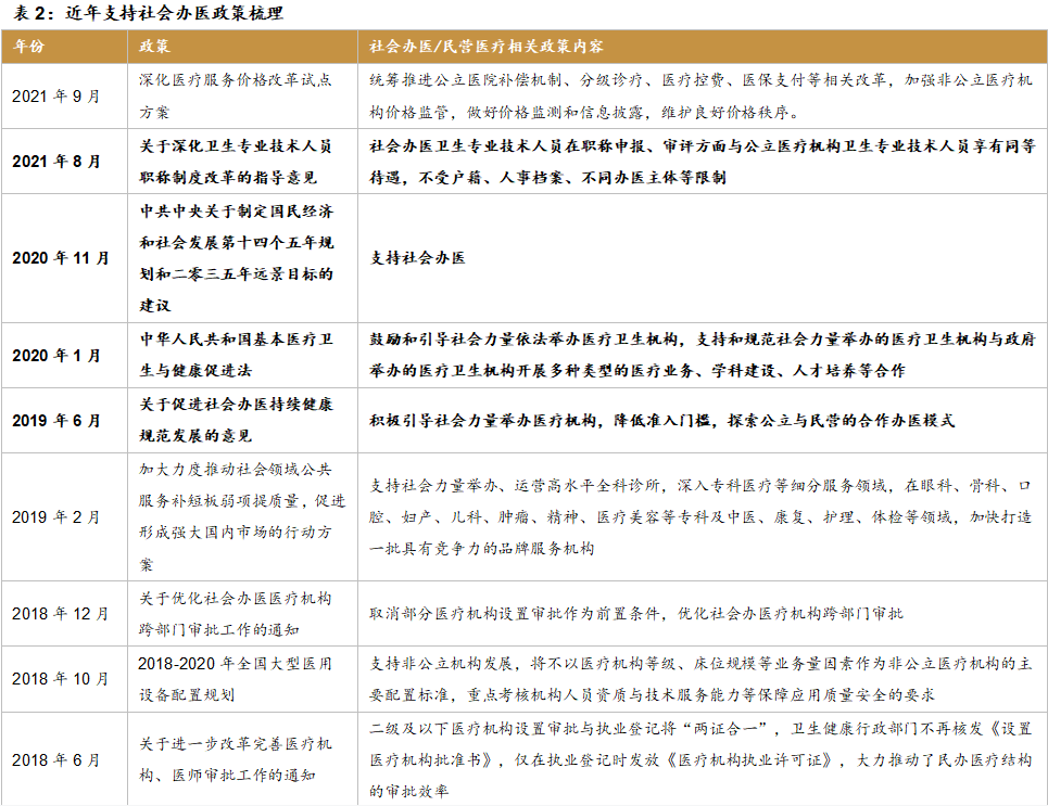 近年来国家积极推进社会办医准入扩容,历年政策鼓励社会办医。2014年,国家卫计委发文,切实将社会办医纳入区域卫生规划统筹考虑,持续提高社会办医管理与质量水平。2015年,国务院发文进一步放宽社会办医准入,并对社会办医持续持支持态度,支持优质社会办医扩容。《2022年中国卫生健康统计年鉴》显示,中国民营医院数量已从2015年的1.5万家迅速扩张至2021年的2.5万家。根据《2021年中国卫生统计年鉴》,我国公立医院承担约84%的门诊人次,公立医疗资源紧张。自2010年起,政府鼓励社会资本进入医疗服务领域,鼓励有能力的社会资本做大做强,并在之后的十年间一直给予民营医疗服务机构政策方面的优待与支持,因此涌现出一批优秀的民营医疗服务机构。2021年8月,政府出台政策,强调社会办医机构专业技术人员在职称申报、审评方面应与公立机构人员享受同等待遇,将进一步促进人才在民营机构就业,进一步鼓励了社会办医。