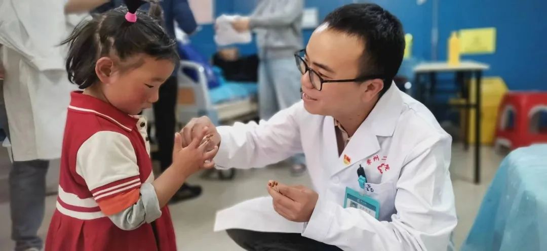 巡诊点上,一个小朋友不小心划伤手指