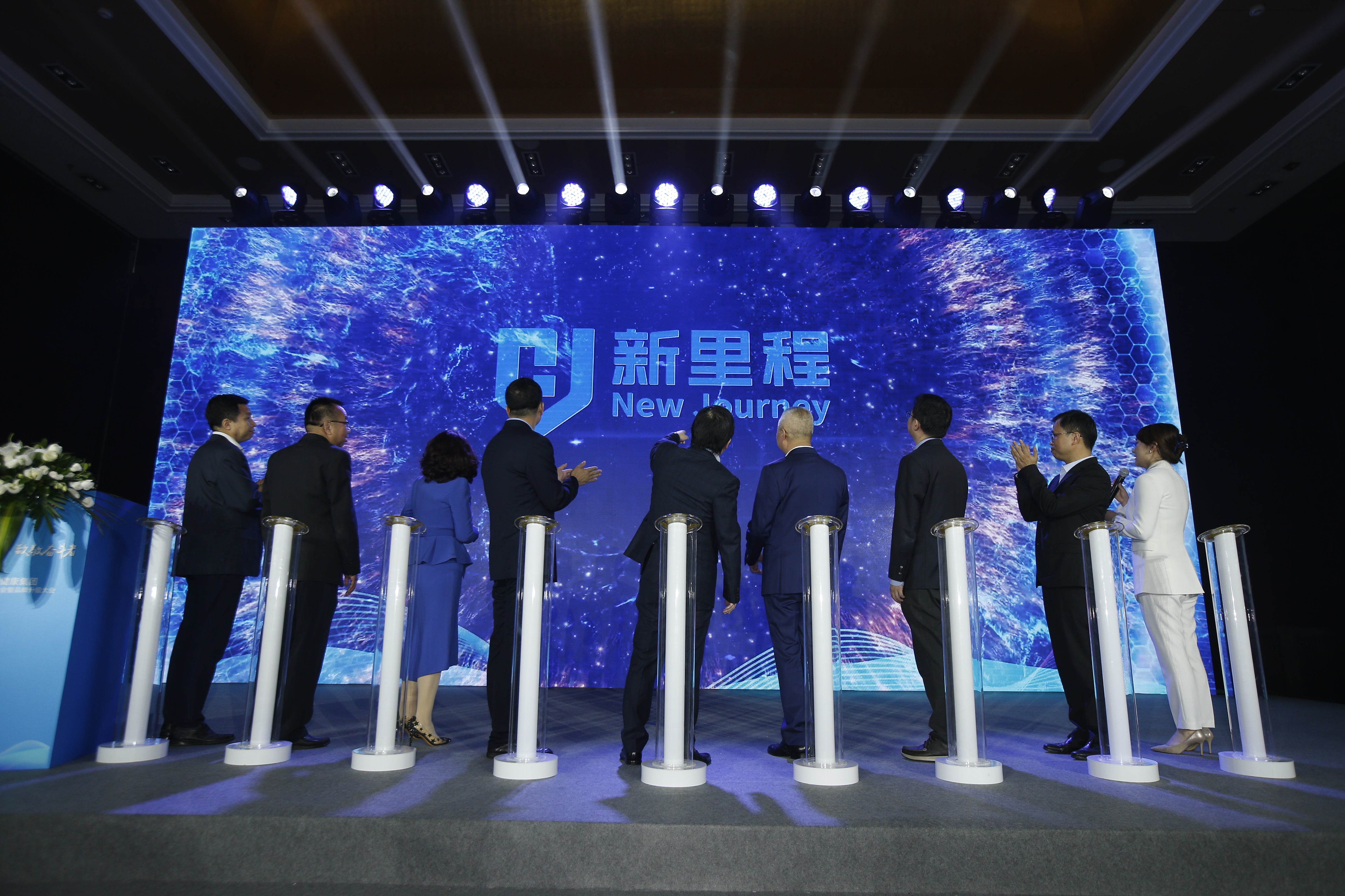 △集团首席执行官林杨林和集团高级副总裁李蜀光、副总裁曹文辉、副总裁关恒业、副总裁许铭桂、副总裁陶琳、首席财务官周子晴、副总裁赵瑞峰、助理总裁李健一同启动按钮,发布集团新品牌和新LOGO