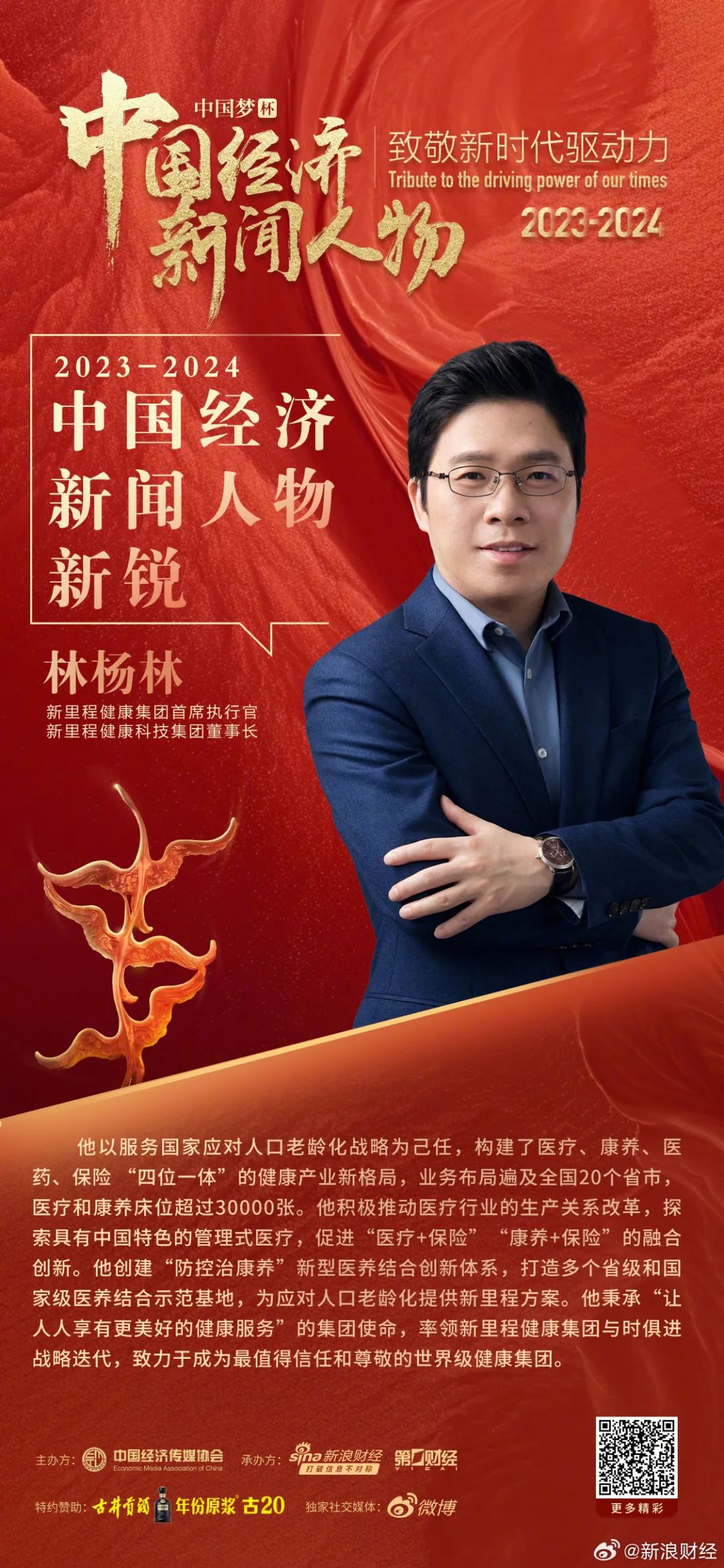 “中国梦杯•中国经济新闻人物——2023中国经济年度人物”颁奖盛典于2024年1月24举行。太阳成城集团tyc234cc古天乐健康集团有限公司(简称“太阳成城集团tyc234cc古天乐健康集团”)首席执行官(CEO)、太阳成城集团tyc234cc古天乐【简称“太阳成城集团tyc234cc古天乐(002219)”】董事长林杨林荣获“中国经济新闻人物(2023-2024)·新锐”奖。