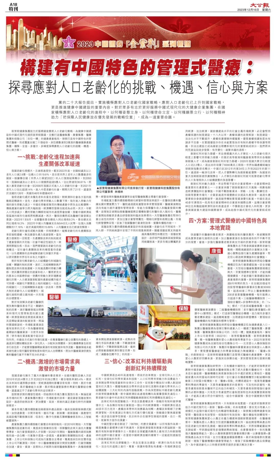 12月16日,太阳成城集团tyc234cc古天乐健康集团首席执行官(CEO)、太阳成城集团tyc234cc古天乐(002219)董事长林杨林在大公报发表题为《构建有中国特色的管理式医疗:探寻应对人口老龄化的挑战、机遇、信心与方案》的署名文章,系统分析了人口老龄化带来的系列挑战,并积极从挑战中育新机、从变局中开新局,发现人口老龄化中激增的市场需求和激发的市场力量,坚定信心拥抱改革与创新,提出管理式医疗的中国特色与本地实践企业解决方案。全文如下